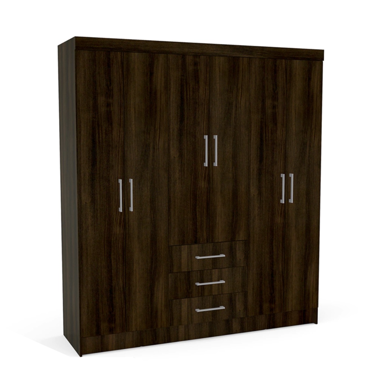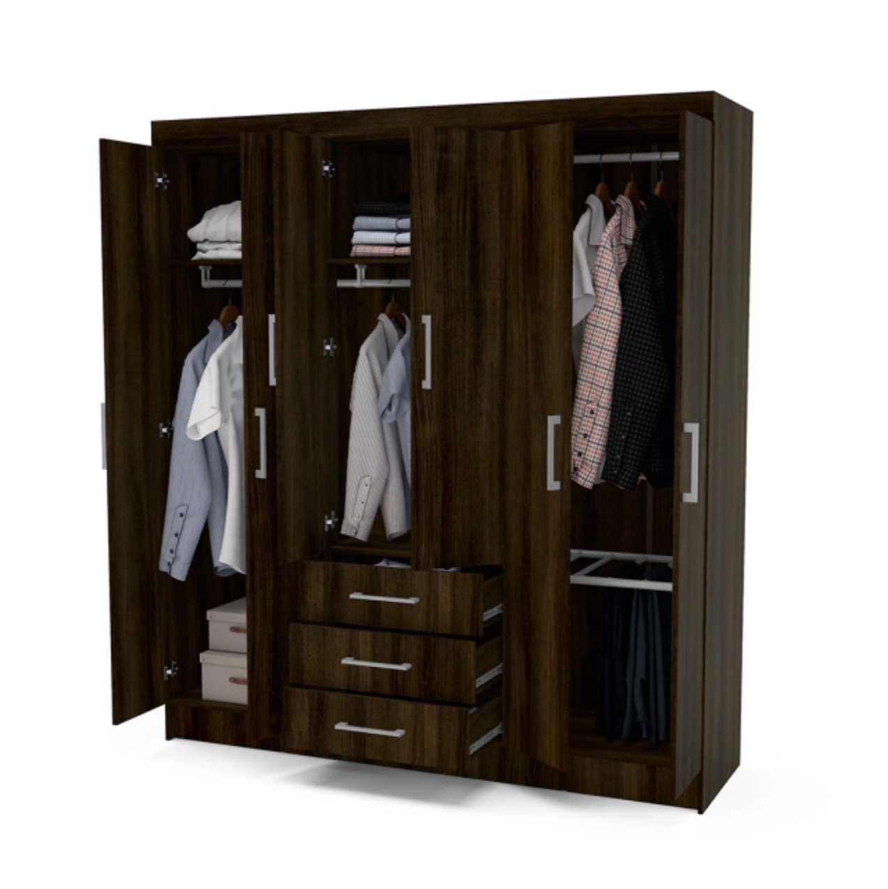 Dos puertas centrales con entrepaño y tubo para guardar colgar prendas. Recubrimiento plástico en la base para evitar la humedad. Jaladeras metálicas resistentes de barra cromadas.